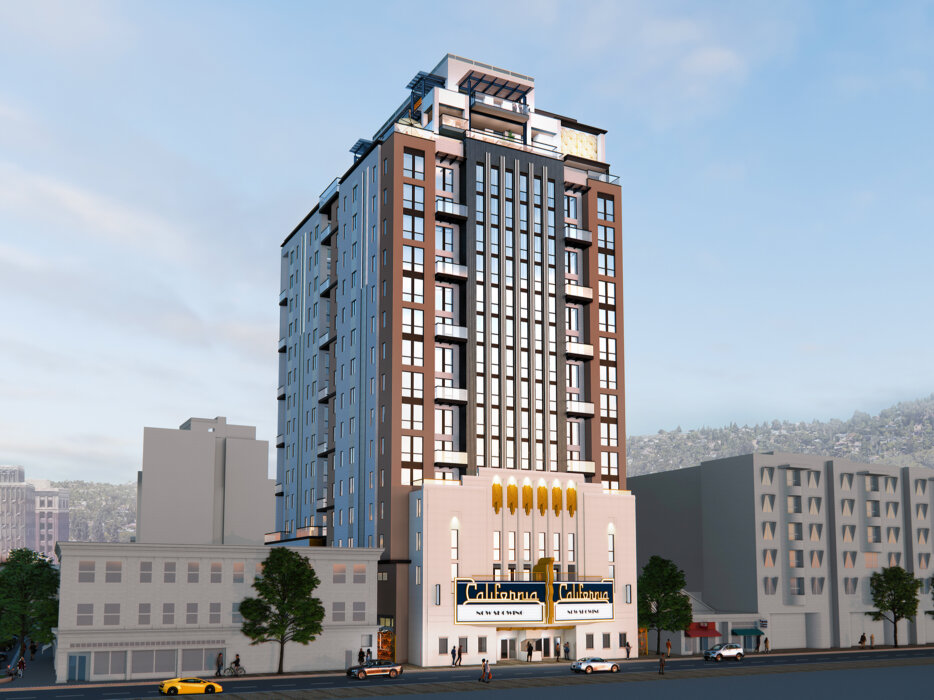 Formerly The California Theater, the new 18-story building will retain its historic Art Deco façade with the distinctive narrow vertical fins replicated on the housing tower, rising to the 15th floor. Additional historical elements such as the marquee, box office, neon and medallions are woven into the new design.