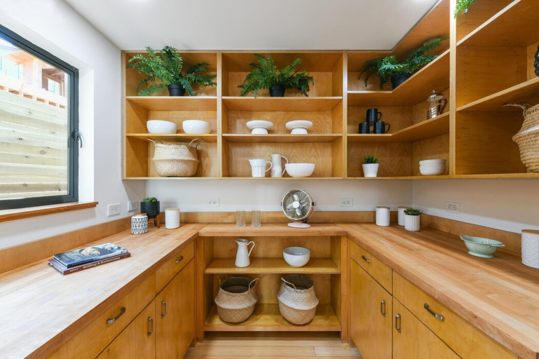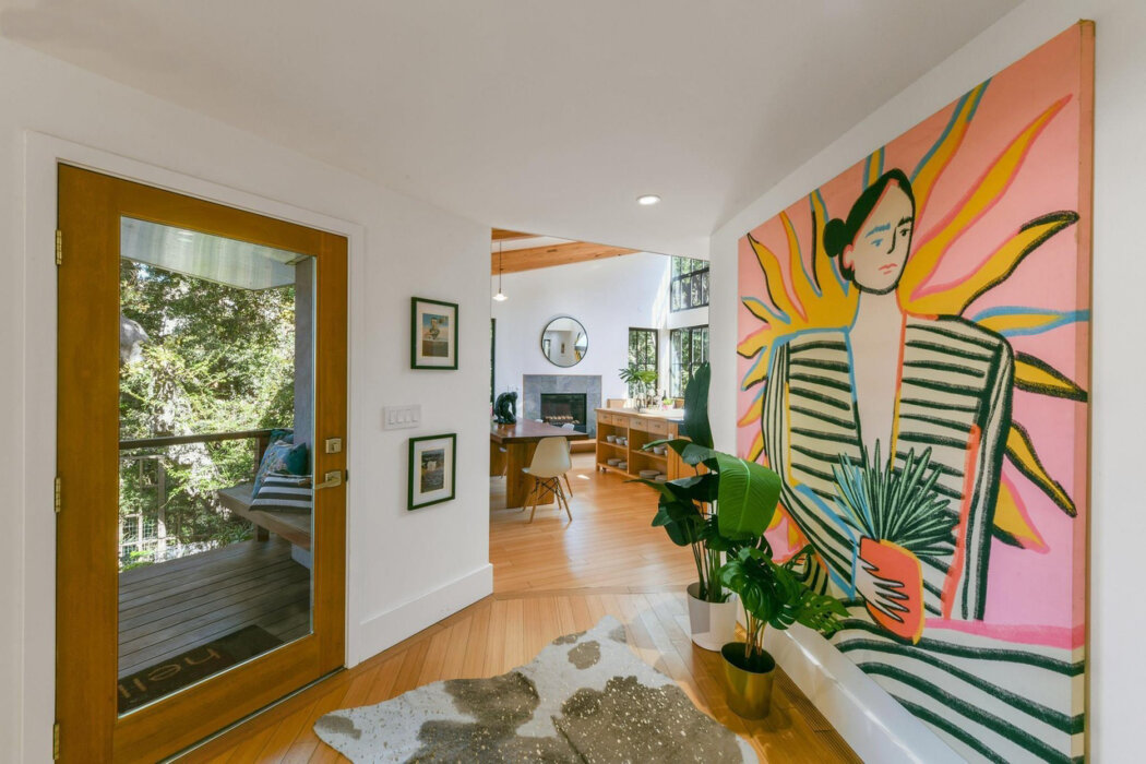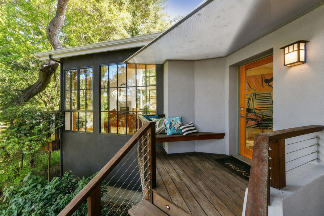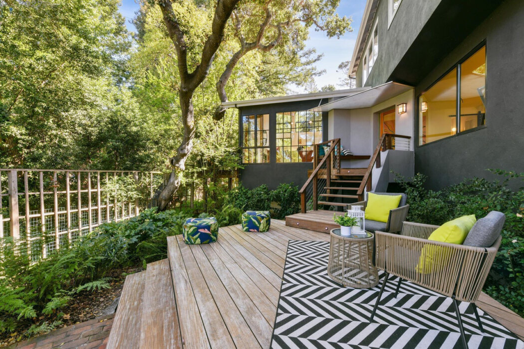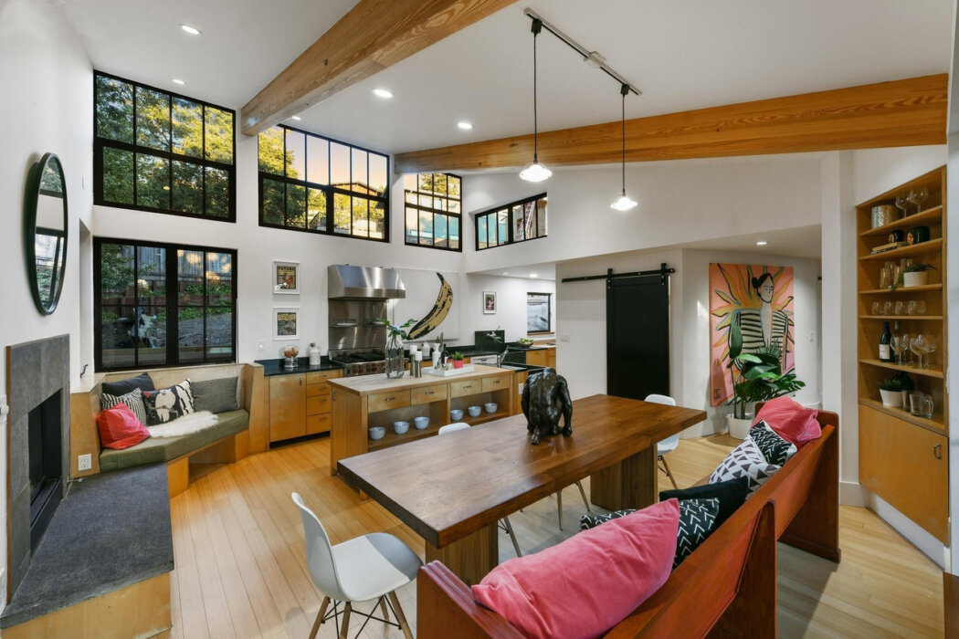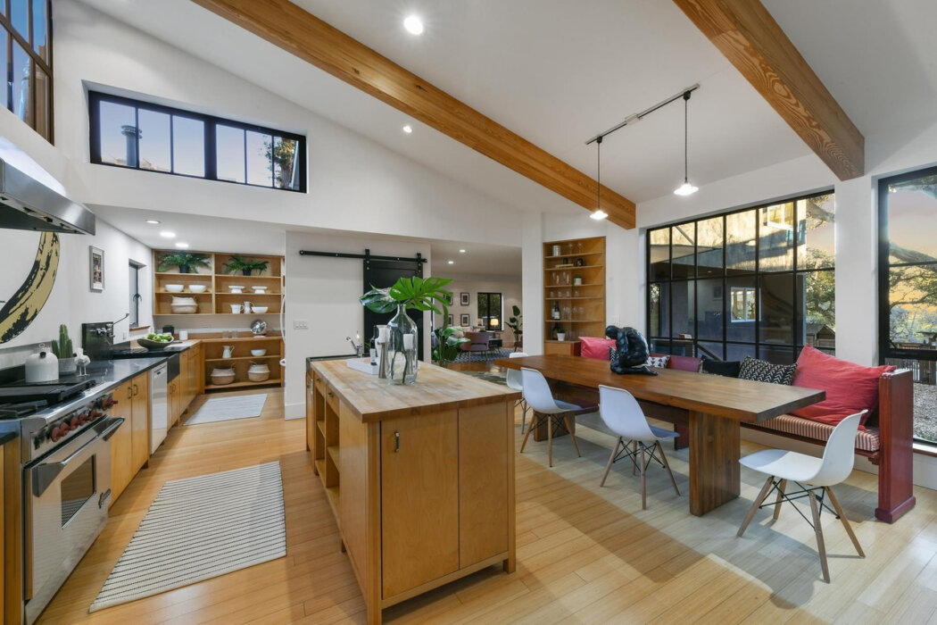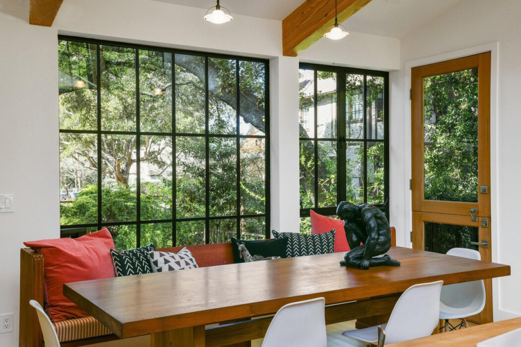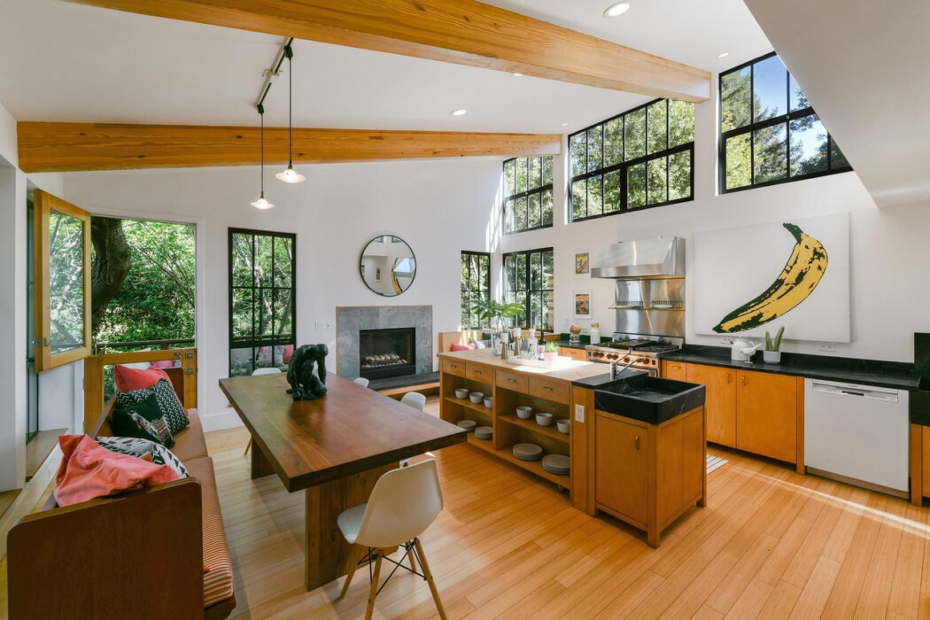For a family that loves to cook we swapped the kitchen and dining area with the living room to provide a new large, airy great room for cooking, doing homework and entertaining. The new space was designed to take advantage of the beautiful natural surroundings, which include graceful oak trees, a garden of native plants and a year-round creek. The new space embraces the landscape with large windows on three sides, an open beam ceiling and a dutch-door opening onto a deck. In addition to the fireplace and seating nook, the kitchen features soapstone counter tops, custom birch cabinets, hand-carved soapstone sinks and a movable central island on casters.