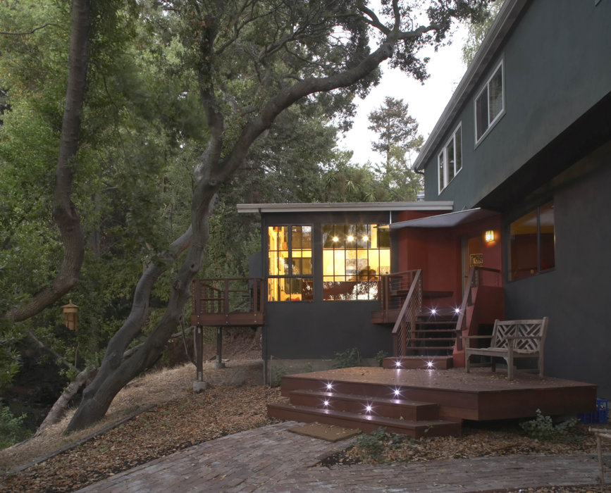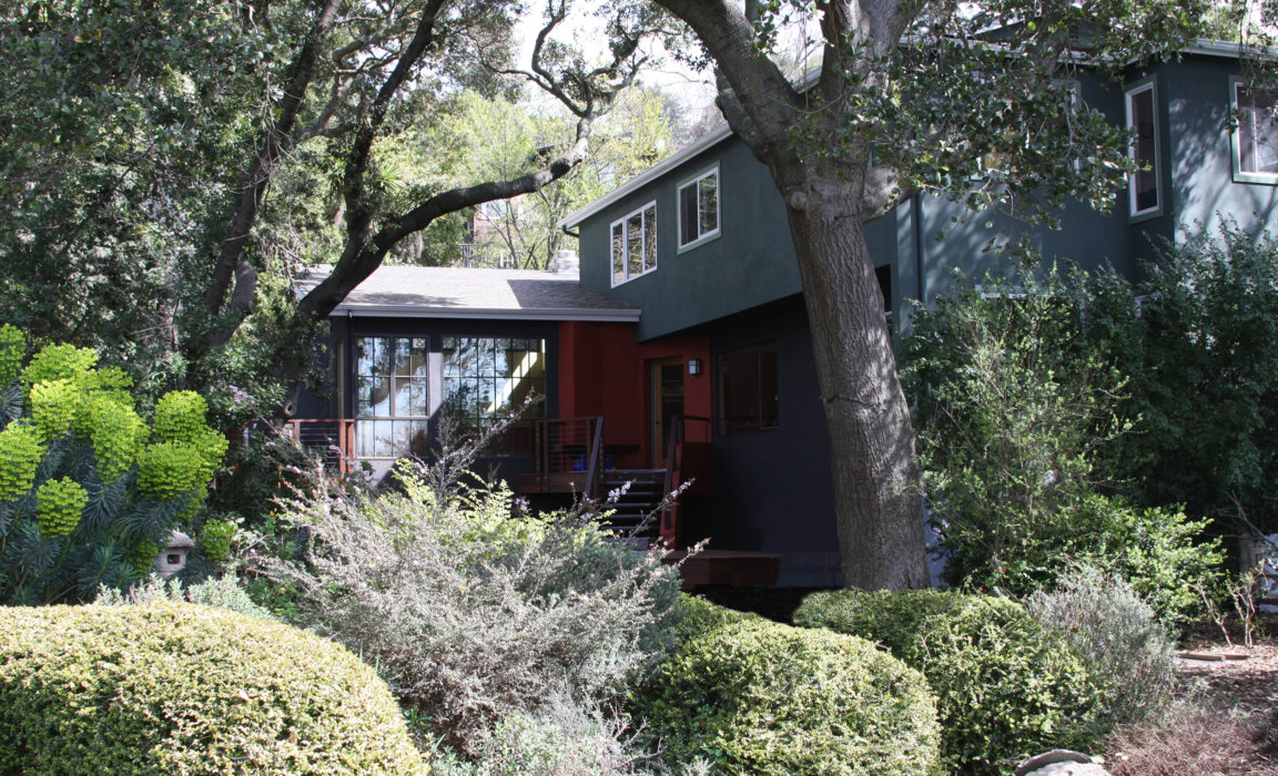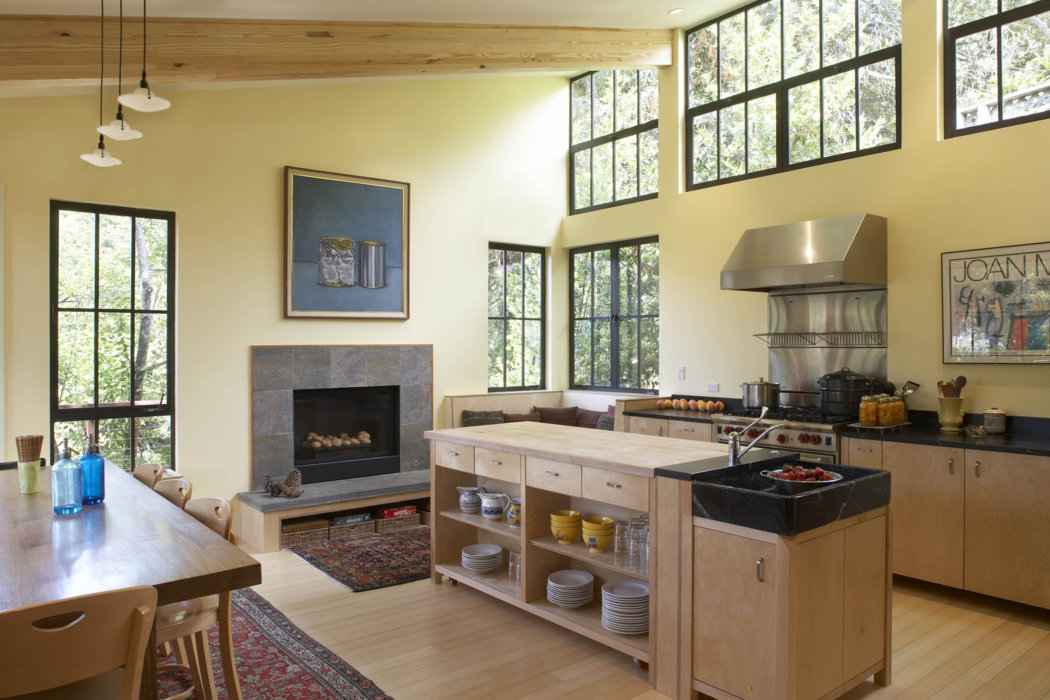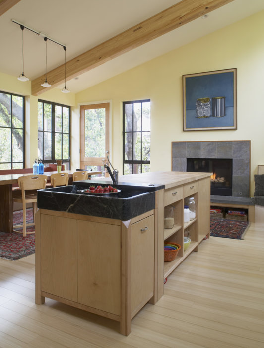 For a family that loves to cook we swapped the kitchen and dining area with the living room to provide a new large, airy great room for cooking, doing homework and entertaining. The new space was designed to take advantage of the beautiful natural surroundings, which include graceful oak trees, a garden of native plants and a year-round creek.