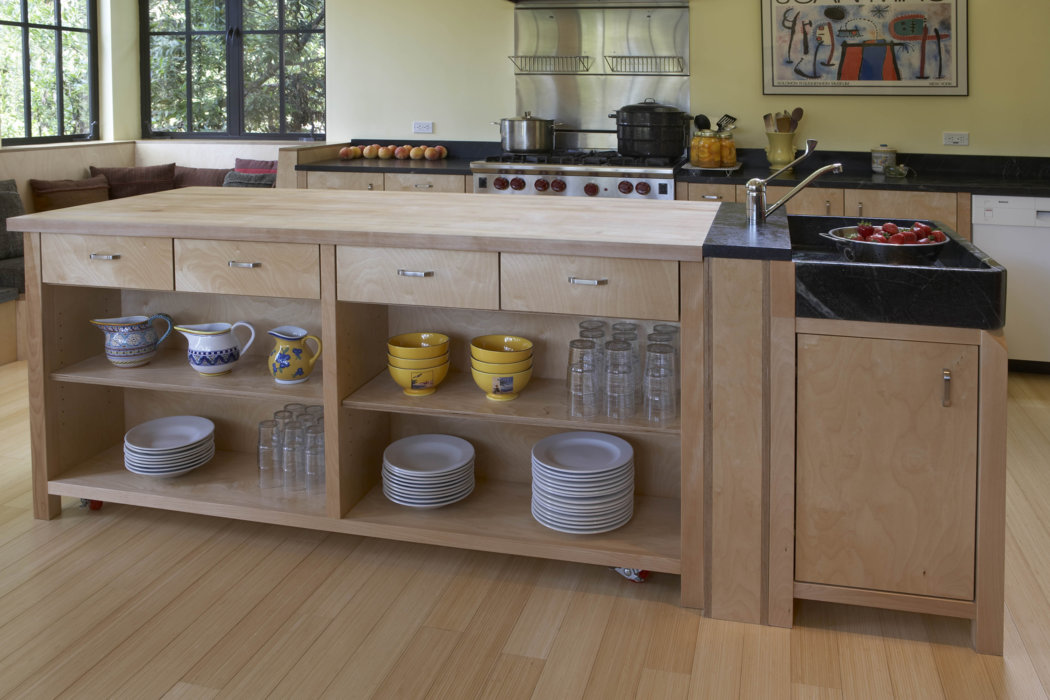 The new space embraces the landscape with large windows on three sides, an open beam ceiling and a dutch-door opening onto a deck. In addition to the fireplace and seating nook, the kitchen features soapstone counter tops, custom birch cabinets, hand-carved soapstone sinks and a movable central island on casters.