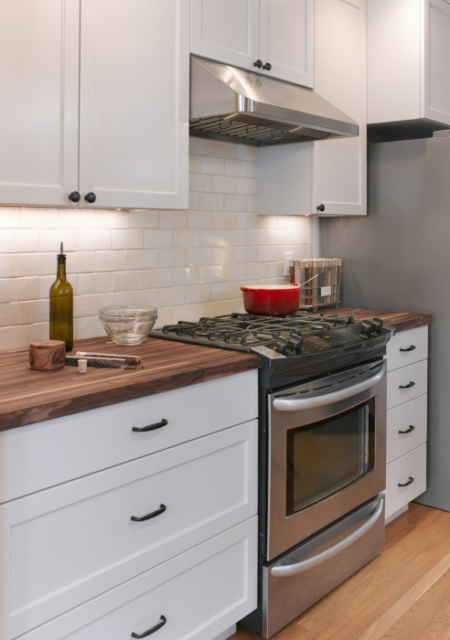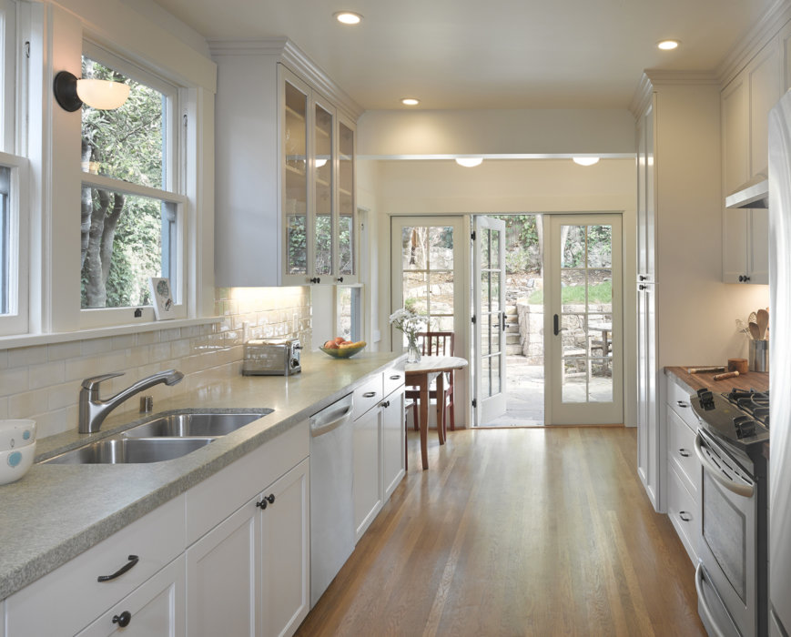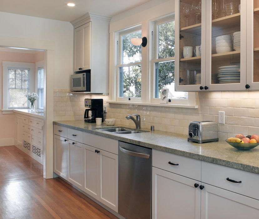 In the Bay Area, a kitchen’s connection to the outdoors is paramount. With this home in the Berkeley hills, the connection to the back yard was impeded by two walls. Our first step was to remove the walls, replacing one of them with a set of French doors. We then remodeled the enlarged kitchen space, creating a bright, light-filled area for cooking, a small dining area and easy access to the yard. The new kitchen features custom cabinets, honed granite and walnut countertops, and a textural subway tile backsplash to play off the 1920’s era of the house.