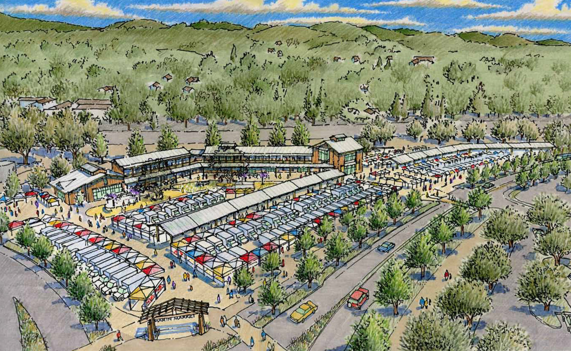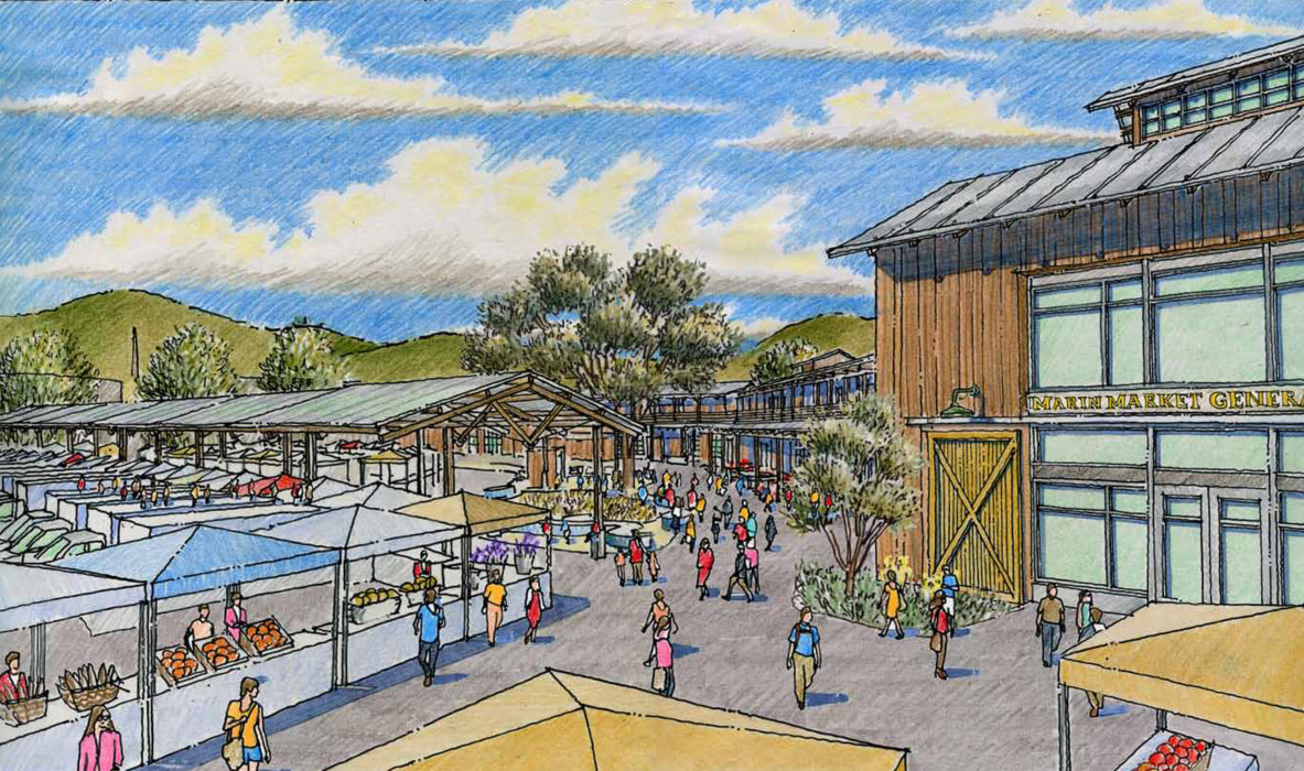 Although large and well established, the Marin Farmer’s Market lacks a permanent home to support the many educational programs offered in conjunction with the farm stands. With input from the farmers, the board of directors, and city officials we provided a richly developed conceptual design that includes classrooms, meeting rooms, a demonstration garden, a general store, retail spaces (café, bakery, butcher), and restaurant. The design features a series of buildings linked by an exterior loggia and opening out onto the market, event and garden areas. Sheltered from wind and noise by the buildings, the inner yard is filled with places to encourage gathering, eating, learning and lingering. The design, inspired by the beautiful agrarian building forms of West Marin County, features simple elegant forms and rustic finishes of wood, steel and glass.