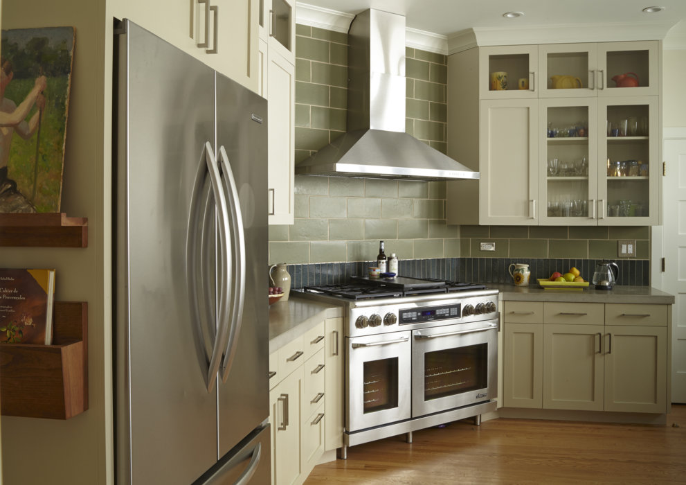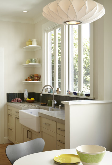The original kitchen layout in this Piedmont home made poor use of the available space. The kitchen was very small with a remote pantry and limited counter and storage space. The new design enlarged the kitchen and relocated appliances for better work flow, created a large easy to use pantry and provided a built-in seating area. The style is a combination of California and French contemporary aesthetics with a muted color palette and contrasting mid-century furnishings. A materials call attention to the importance of craft with large hand-made tiles, custom cabinetry and poured-in-place concrete counter tops.
