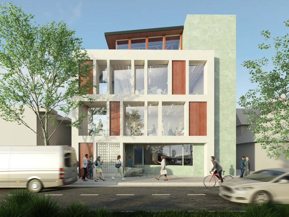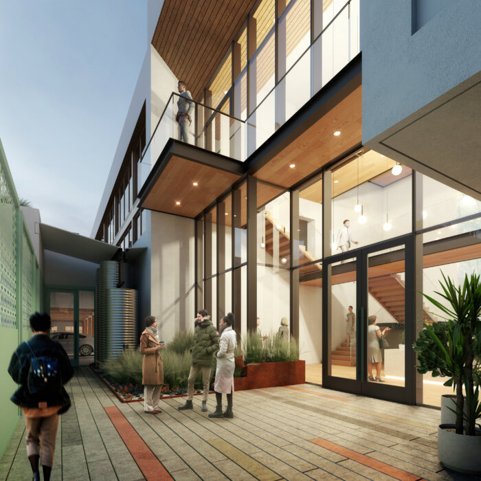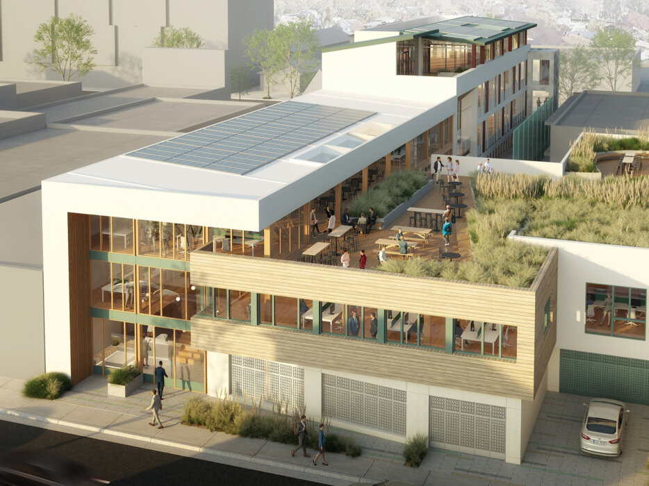 The second building, fronting San Pablo Avenue, will rise four stories and comprise 15,000 square feet of mixed-use space, including offices, research and development areas, and a single residential unit. The program also includes 23 off-street parking spaces and a dedicated loading zone to support flexible tenant needs.