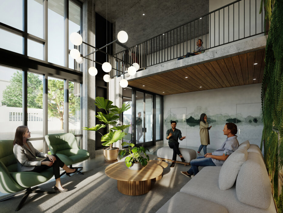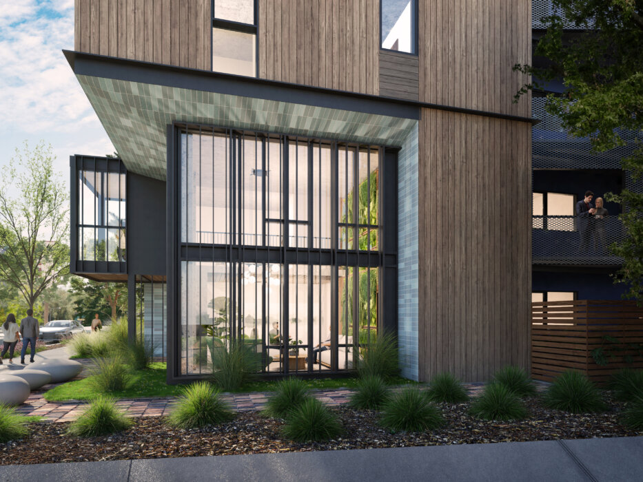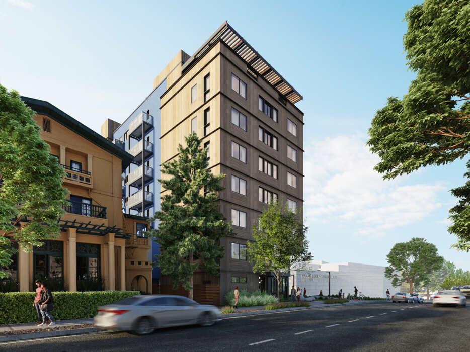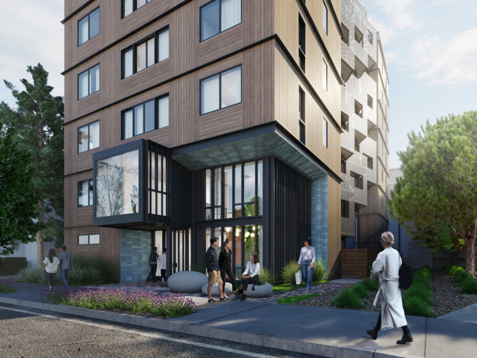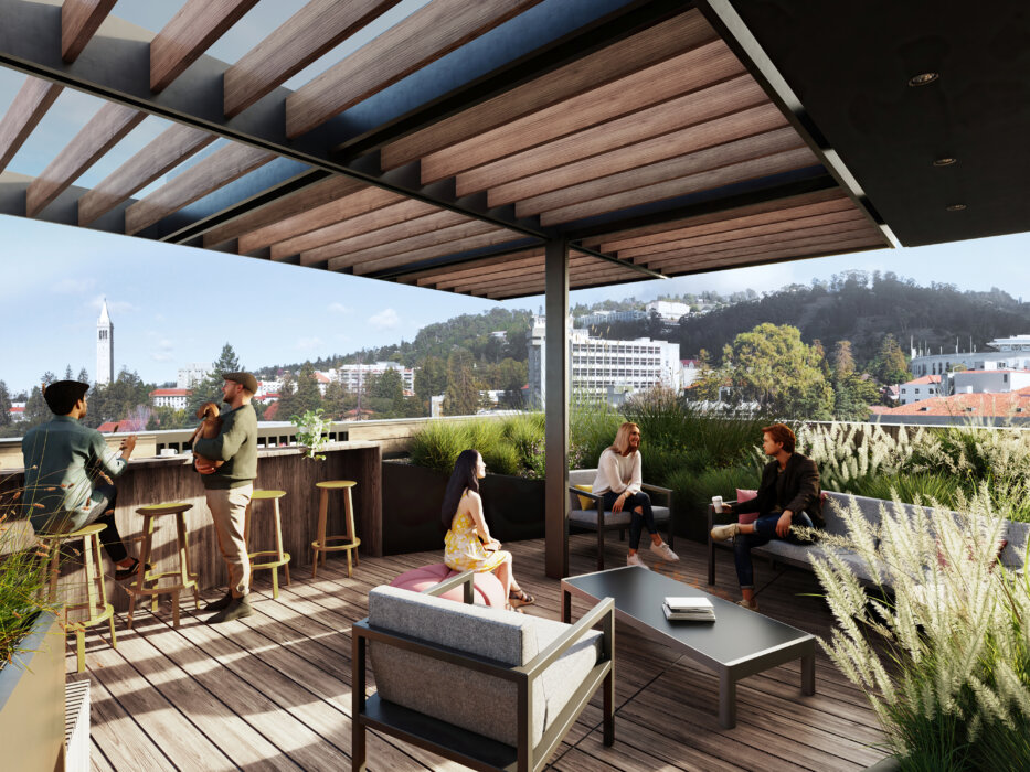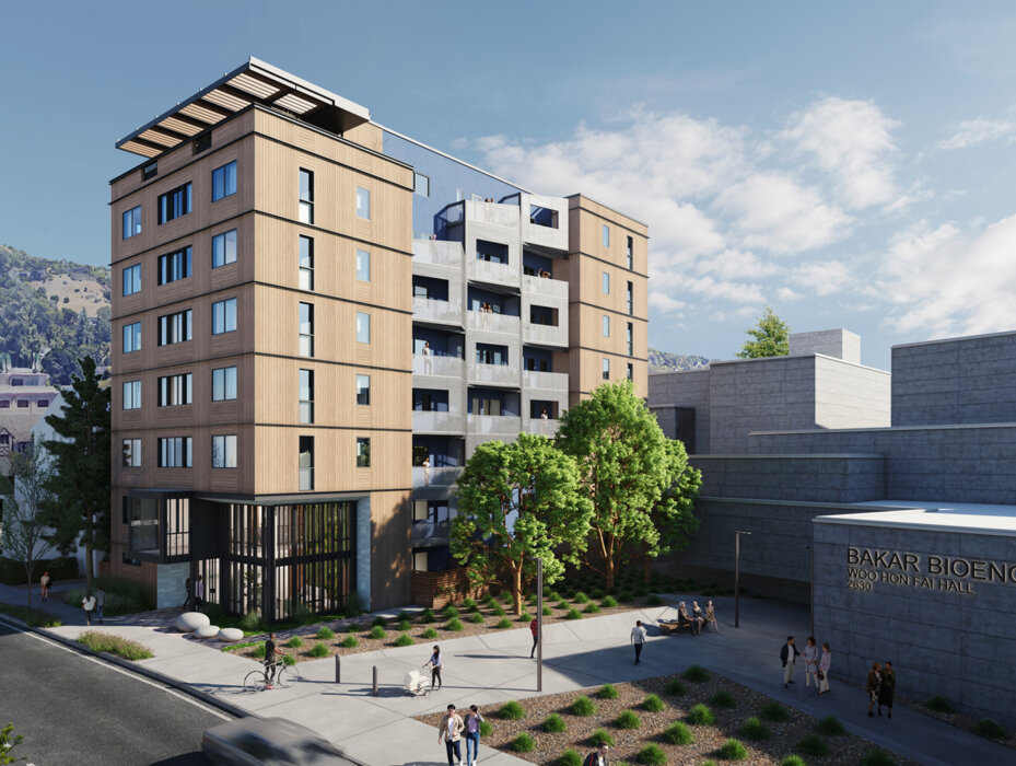 Nestled on a unique site directly opposite UC Berkeley and between two starkly different Berkeley landmarks — the historic Bancroft Hotel and the brutalist Bakar BioEnginuity Hub – this new building seeks to honor its neighbors while holding its own as a contemporary structure. With both context and program in mind, the design provides 78 units of student housing with inviting gatherings areas just a few steps from campus. The warm modern design employs wood siding (the actual material is a cement siding that mimics the texture and color of wood) chosen as a contrast to the heavy board-formed concrete of the BioEnginuity Hub and the bright concrete stucco of the Hotel. The common spaces are designed to take full advantage of the unique context: the double height lobby faces out to the neighboring courtyard, the cascading balconies reference the geometry of the Bio Hub, and the expansive roof deck overlooks the UCB campus, East Bay hills, and the San Francisco Bay. The 34,000 square foot building is currently in the entitlements phase.
