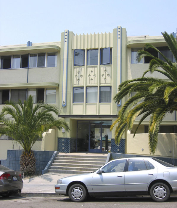The owner of this 50 unit apartment building wanted to approve its appearance but had only a modest budget for the project. To meet his needs we developed a series of additions to the façade that could be attached without major structural involvement. The design addressed the long, plain façade by adding a new central entry “tower” consisting of deco-styled columns and patterned details. Curved awnings were also added along the building façade to provide dimension as well as shade from the afternoon sun. The project was finished with new landscaping and removal of block walls that kept the building shut off from the street.